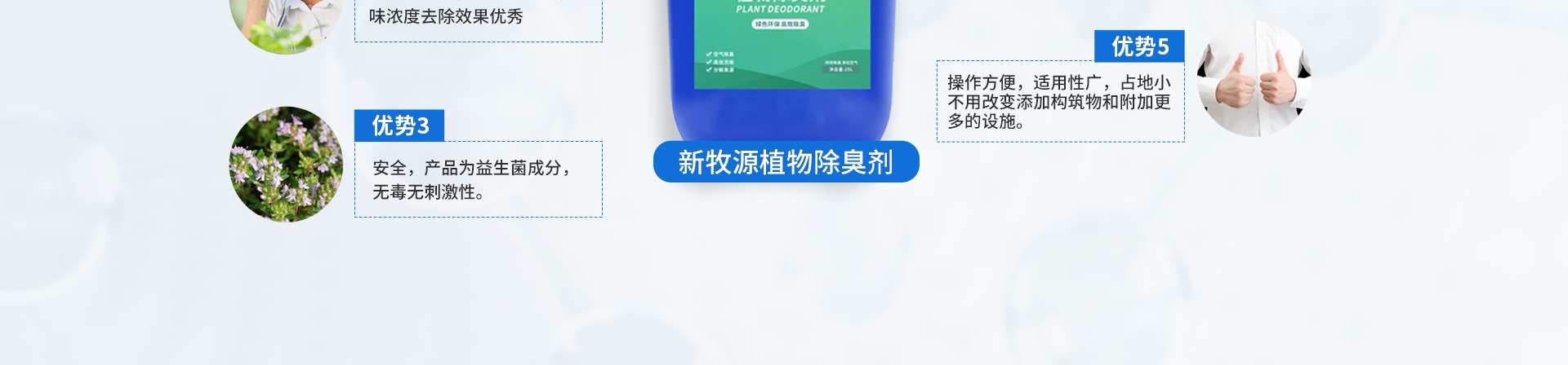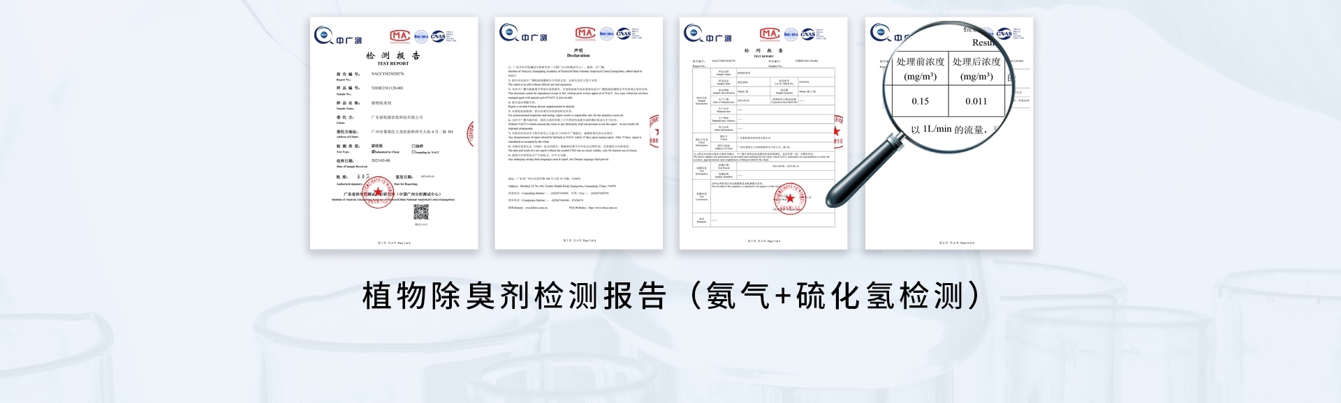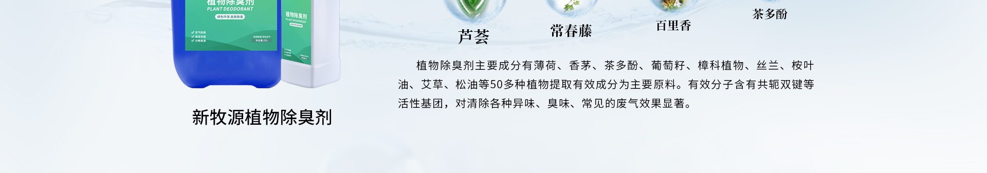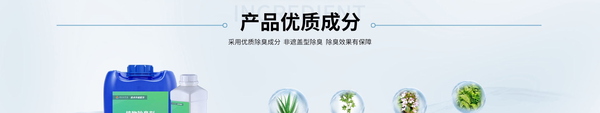 從天然植物中分離提取的天然成分,具有抑菌、殺菌和除臭功效(xiào),對氨、硫化氫等無機物和低分子脂肪酸、胺類、醛類、酮類、醚(mí)類、鹵代烴等有機物等惡(è)臭有吸附、遮蓋、良(liáng)好的分解(jiě),或者與異味分子發生(shēng)碰撞, 進(jìn)行反應,促使異味分子發生改變原有分子結構, 使之失去臭味,達到去除臭味的效(xiào)果。
